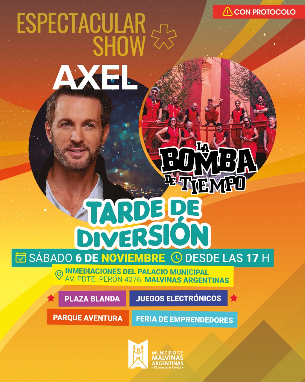 En un imponente escenario actuarán el grupo musical de percusión “La Bomba de Tiempo” y el cantante y compositor argentino Axel, quien cuenta con una amplia y reconocida trayectoria.