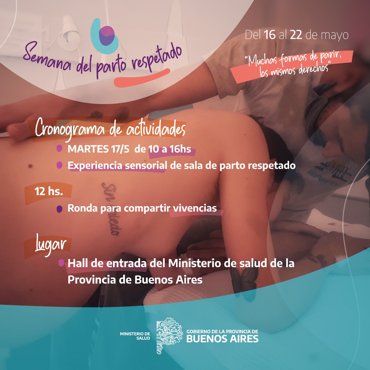 Bajo el lema “Muchas formas de parir, los mismos derechos”, desde hoy y hasta el domingo 22 de mayo, la cartera de Salud de la Provincia adhiere a la “Semana Mundial del Parto Respetado” y llevará adelante diversas y novedosas actividades organizadas en conjunto con hospitales, otras instituciones del Gobierno Provincial, y secretarías de salud de los municipios.Estas acciones van de la mano con el trabajo de transformación que desarrolla el ministerio de Salud provincial para que las mujeres y personas con capacidad de gestar sean las verdaderas protagonistas en ese proceso, y para que los equipos de salud intervinientes puedan acompañar desde el deseo; generar las condiciones para que los derechos se cumplan, brindar toda la información y minimizar las intervenciones innecesarias.En ese contexto, una actividad singular que se realizará mañana de 10 a 15 horas incluye la instalación de un stand de “Experiencia sensorial de parto respetado” en la sede central de la cartera sanitaria, ubicada en 51 entre 17 y 18, en el hall de planta baja, donde las personas que lo deseen podrán ingresar a un espacio donde se recreará una sala de parto.La muestra estará a cargo del equipo de la dirección de Maternidad y Salud Perinatal, y se podrán encontrar con elementos que suelen usarse en las maternidades para facilitar el parto fisiológico como; una pelota, colchoneta, elementos auditivos, olfativos, y telas para poder colgarse. El objetivo es generar un ámbito para que; desde lo visual, la experiencia auditiva, olfativa y táctil se puedan mostrar los distintos modos de parir con mínima intervención. Esta experiencia se realizará en los hospitales para que la población que concurre conozca estas formas, y los equipos de salud discutan la guía de parto respetado del Ministerio.En simultáneo se expondrá, también en el hall de la sede central, una muestra de fotografías enviadas por los hospitales, donde aparecen en imágenes modos no tradicionales de partos, que apuntan a visibilizar que en la Provincia de Buenos Aires hay distintas formas en las que se pueda parir. A las 12, se realizará una ronda de intercambio con obstetras de la región de la que participará la directora provincial de Equidad de Género en Salud, Sabrina Balaña, y se invita a los trabajadores/as del ministerio a reflexionar sobre los modos de parir, derechos y vivencias.ACTIVIDADESHoy se desarrolló la apertura de la Semana del Parto Respetado en la Provincia, con un encuentro con trabajadoras y trabajadores en la Maternidad Estela de Carlotto, que fue encabezado por la directora de Maternidad y Salud Perinatal del Ministerio, Delia Zanlungo, donde se intercambiaron experiencias vividas en ese establecimiento bonaerense pionero en garantizar este tipo de prácticas en el ámbito público.El jueves, en tanto, en el hospital “Oñativia” de Almirante Brown habrá una jornada masiva de promoción de la donación de leche humana a bancos de leche, que contará con la participación activa de la comunidad. Mientras que, en Quilmes, en Casa de la Cultura ubicada en Rivadavia N° 383, se realizará la jornada “Semana del Parto Respetado. Avances y desafíos en los cuidados de obstetricia”, organizada por la secretaría de Salud municipal y destinada a los equipos de salud de ese distrito. Allí participarán la directora provincial de Equidad de Género en Salud, Sabrina Balaña, y la diputada provincial, Mariana Larroque.Por último, el viernes a las 10 en el hospital “Ana Goitia” de Avellaneda se desarrollará el Foro Regional Camino al Parto Respetado Región Sanitaria VI y XII. Se trata de la actividad principal de la Semana de Parto Respetado 2022 en la Provincia, y con este encuentro se cierra el proceso, iniciado en 2020, de foros regionales de debate del proyecto de la Ley provincial de Creación del Plan Estratégico para la Implementación del Parto Respetado en territorio bonaerense.Esta actividad es organizada en conjunto con el Ministerio de las Mujeres, Políticas de Géneros y Diversidad Sexual y la Cámara de Diputados de la Provincia. Están convocados trabajadoras y trabajadores de la salud, organizaciones de la sociedad civil, universidades, colegios profesionales, referentes territoriales, autoridades sanitarias y políticas de las regiones sanitarias VI y XII, que será encabezada por los