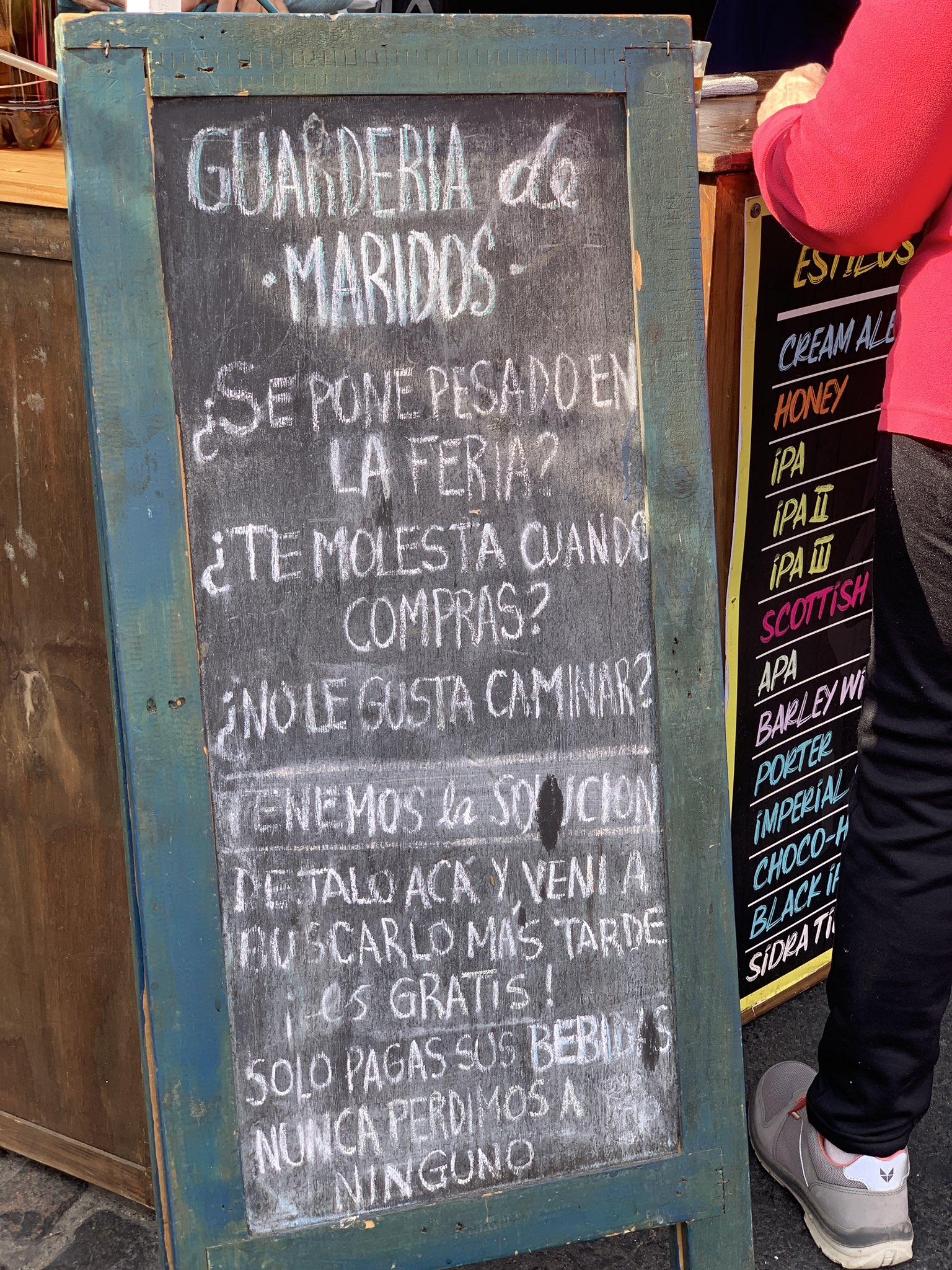 Sin embargo, esta no es una nota hecha para ponderar las bondades de la Feria de Mataderos, si no para dar testimonio de un cartel que hizo descostillar de la risa a más de uno en las redes sociales. ¿Qué se puede apreciar en él? Un oferta irresistible para las mujeres que circulan por la zona: “Guardería para maridos”.
