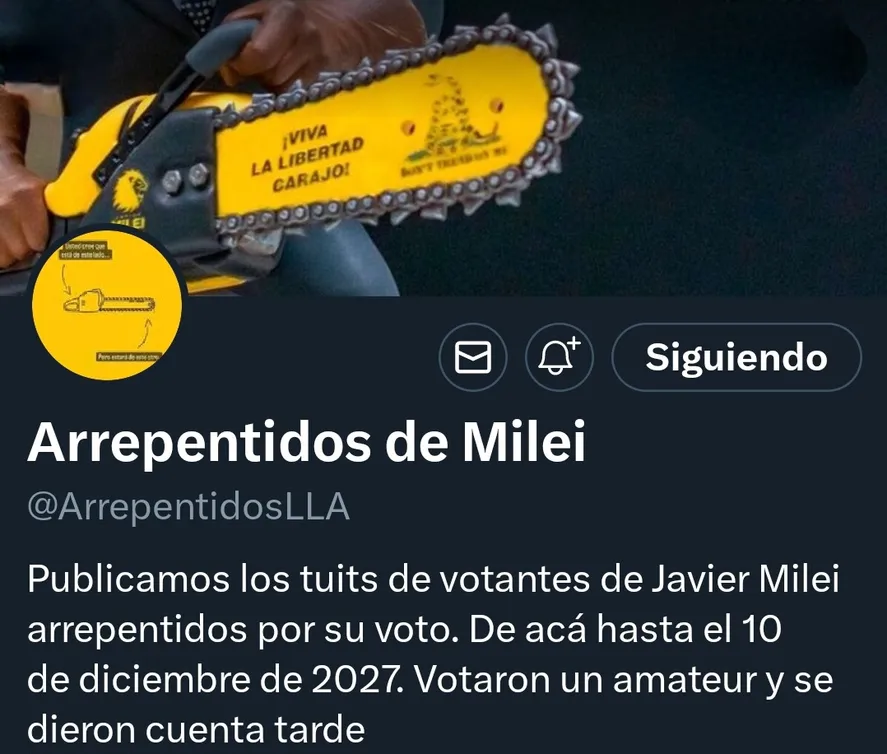 Ante esta andanada de ciudadanos que eligieron al libertario al colocar su voto, y ya muestran algunas dudas sobre el desarrollo de lo que serán sus políticas y como los afectarán individualmente, de manera hiperveloz a alguien ubicado de la vereda de enfrente política, se le ocurrió agrupar estas historias de desilusión en una cuenta específica dedicada exclusivamente a recopilarlas, a la que denominó “Arrepentidos de Milei“.
