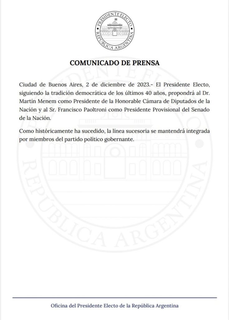 @JMilei, por la confianza depositada en mí para ser el candidato a la presidencia provisional del Senado. De ser elegido voy a trabajar incansablemente para estar a la altura y generar los consensos necesarios para la reconstrucción Argentina.
