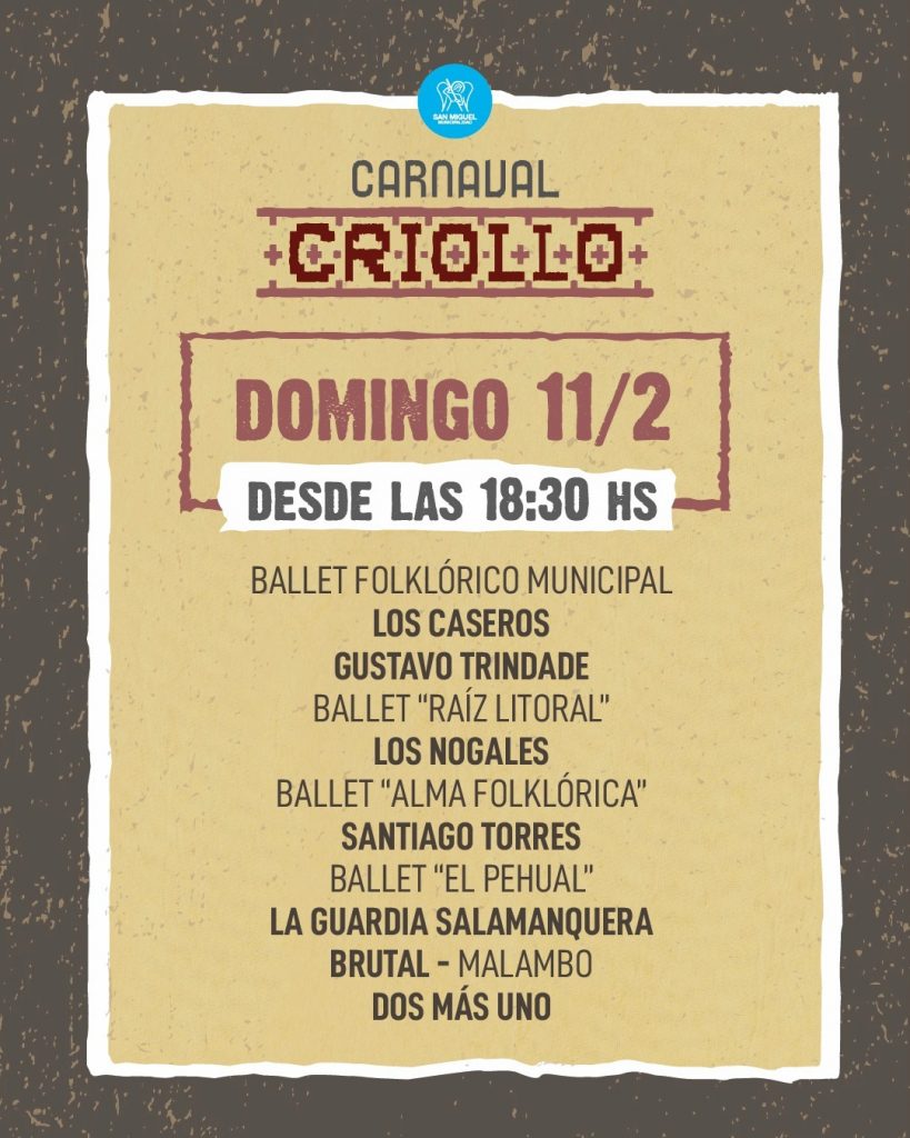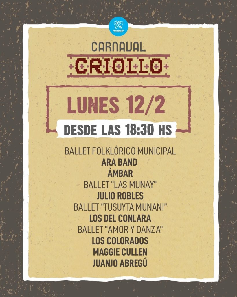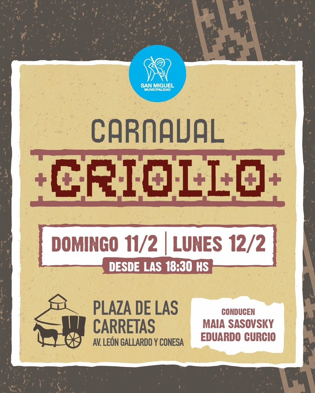 Acercándose las fechas de carnaval, la Municipalidad de San Miguel se prepara para celebrar como todos los años el tradicional Carnaval Criollo, un evento folclórico con un fuerte sentido de pertenencia local. Se realizará el domingo 11 y lunes 12 de febrero, en la Plaza de las Carretas, un emblemático escenario para esta celebración.