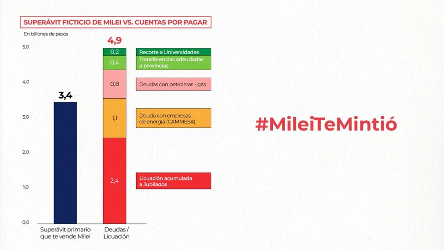 “Sin ningún logro para mostrar en estos 4 meses, el gobierno se quiere inventar uno con un superávit ficticio. Este papelón tiene dos pilares: deuda impaga con importadores y energéticas y licuación a jubilados, universidades, provincias y obra pública”, explicaron.