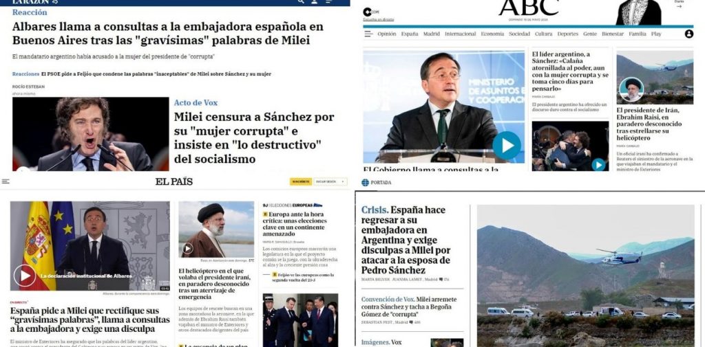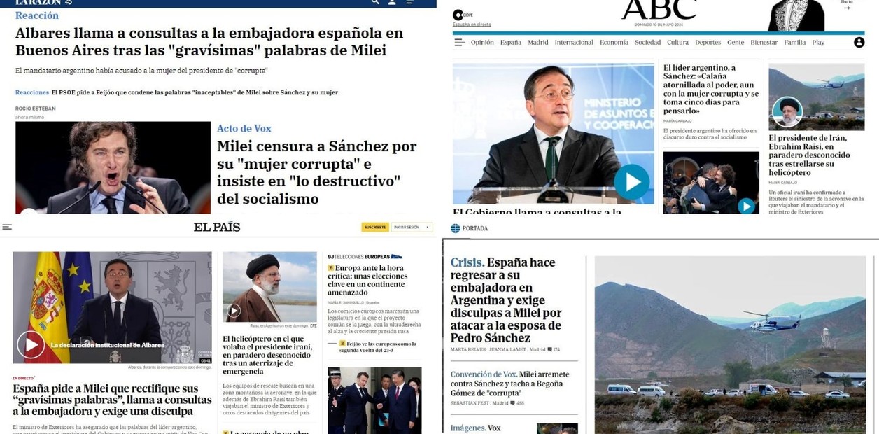 En una línea similar planteó su edición web El Mundo. Tres noticias hablan sobre la incipiente crisis diplomática entre la Argentina y España entre las que se contabilizan una galería de fotos sobre la convención de Vox con dos estrellas de peso internacional invitadas, Milei y Le Pen. Sin embargo, la foto de apertura está dedicada al accidente del helicóptero del presidente de Irán.