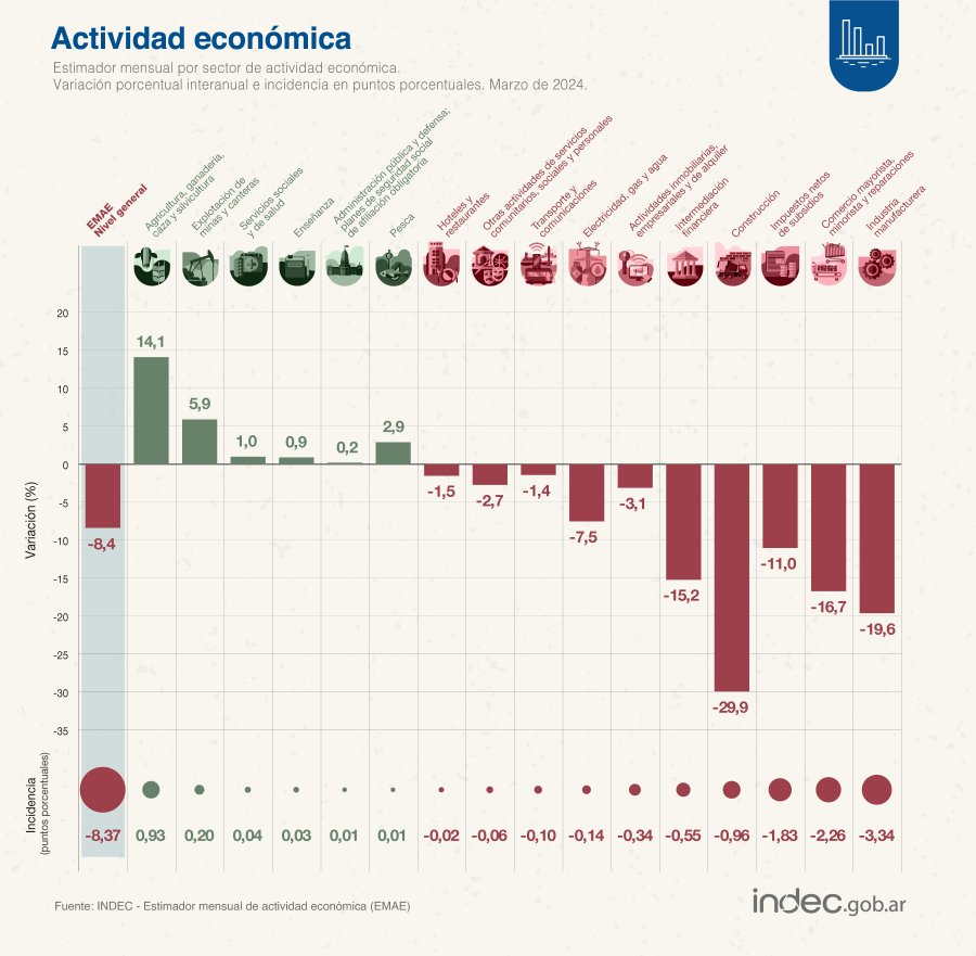 El Instituto Nacional de Estadística y Censos de la República Argentina (INDEC) anunció este miércoles que la actividad económica volvió a caer en marzo, marcando así su quinto mes consecutivo a la baja. Diez sectores evidenciaron caídas en comparación interanual -es decir los mismos meses pero el año pasado-, entre los que destacan la construcción y la Industria manufacturera.