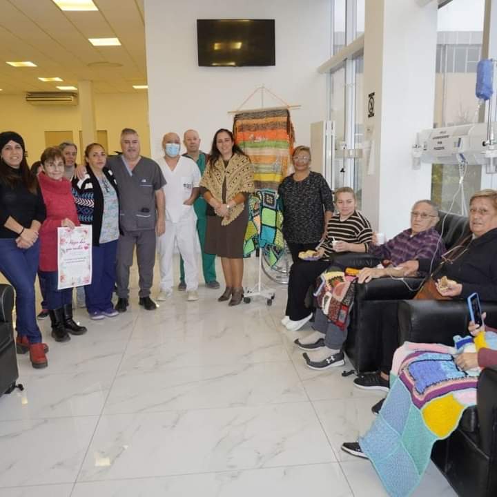 👉Miriam y Gisela, en conjunto con sus compañeras tejedoras del espacio “Tiempo para Crear” llevaron a cabo un trabajo con la comunidad de vecinas paceñas para brindarle a los pacientes que se realizan quimioterapia en el hospital Oncológico de #JoséCPaz mantas tejidas.