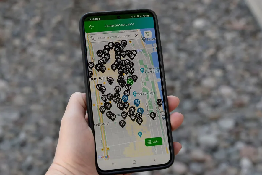 Si eliges el mapa, al tocar el icono del negocio se despliegan sus datos: nombre, dirección, descuento, tope del descuento y días de vigencia del beneficio. La nueva funcionalidad permite también buscar comercios por rubro o nombre en cualquier lugar de la provincia de Buenos Aires.