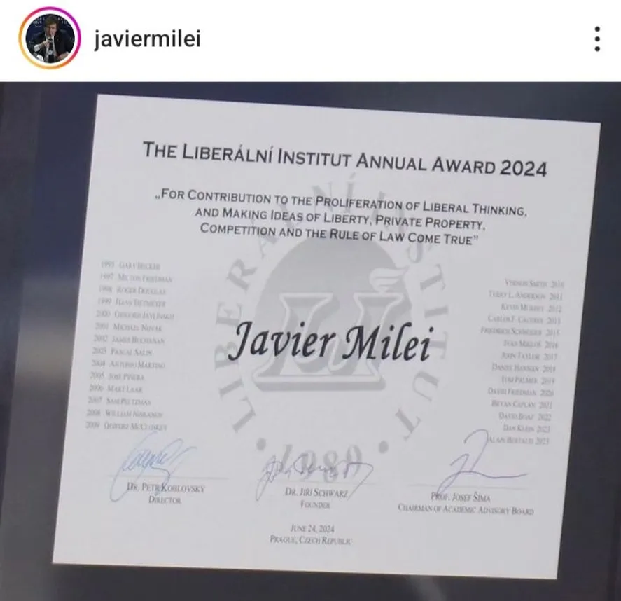 Este martes 25 de junio el presidente Javier Milei compartió una foto del reconocimiento que recibió del Instituto Liberal de Praga, pero su director lo desconoció y aclaró que no tenían “nada que ver”.