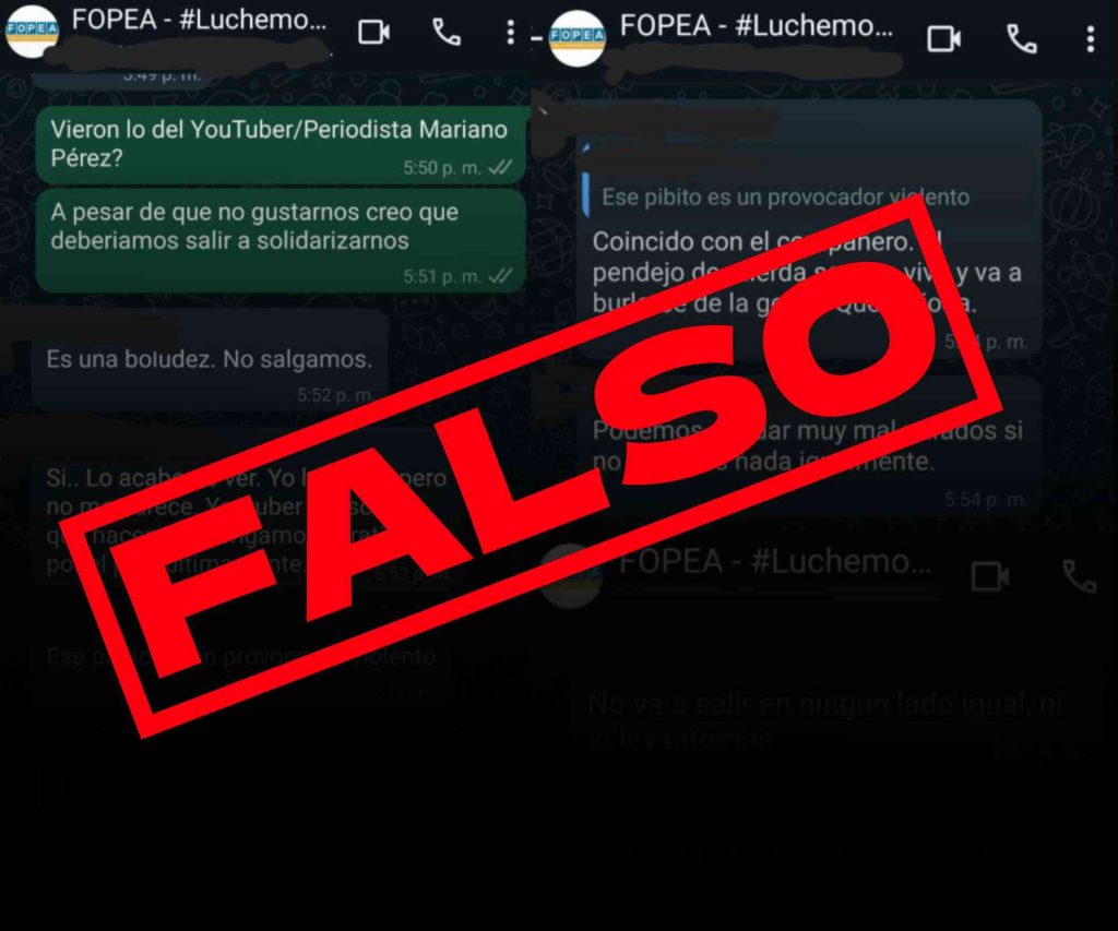 Ese diálogo es FALSO. Jamás existió esa conversación. Por tanto, su difusión, atribuyéndole responsabilidad a FOPEA, tiene la clara intención de desprestigiar a esta organización.