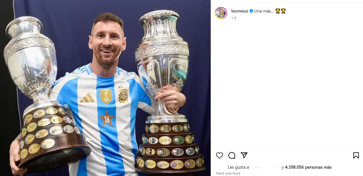 El astro rosarino, quien no dialogó con la prensa, expresó su alegría en su cuenta de Instagram. “Una más…”, escribió junto a una imagen en la que se lo ve posando con los dos trofeos de Copa América que conquistó en las últimas dos ediciones del certamen continental.