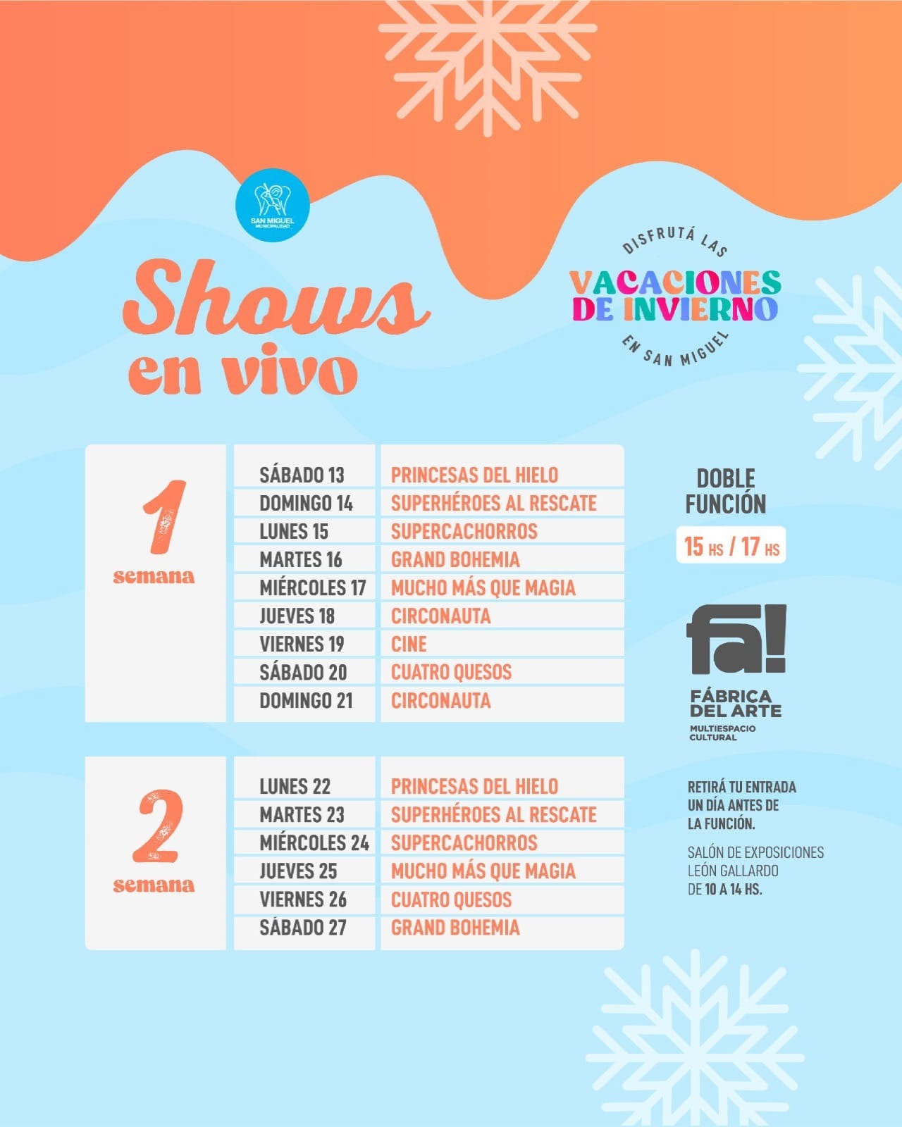 Vacaciones de invierno en San Miguel: se vienen shows, ferias y actividades para toda la familia .Habrá espectáculos del 13 al 27 de julio, una feria de emprendedores, con el fin de que los vecinos puedan acceder a propuestas culturales cerca de sus casas