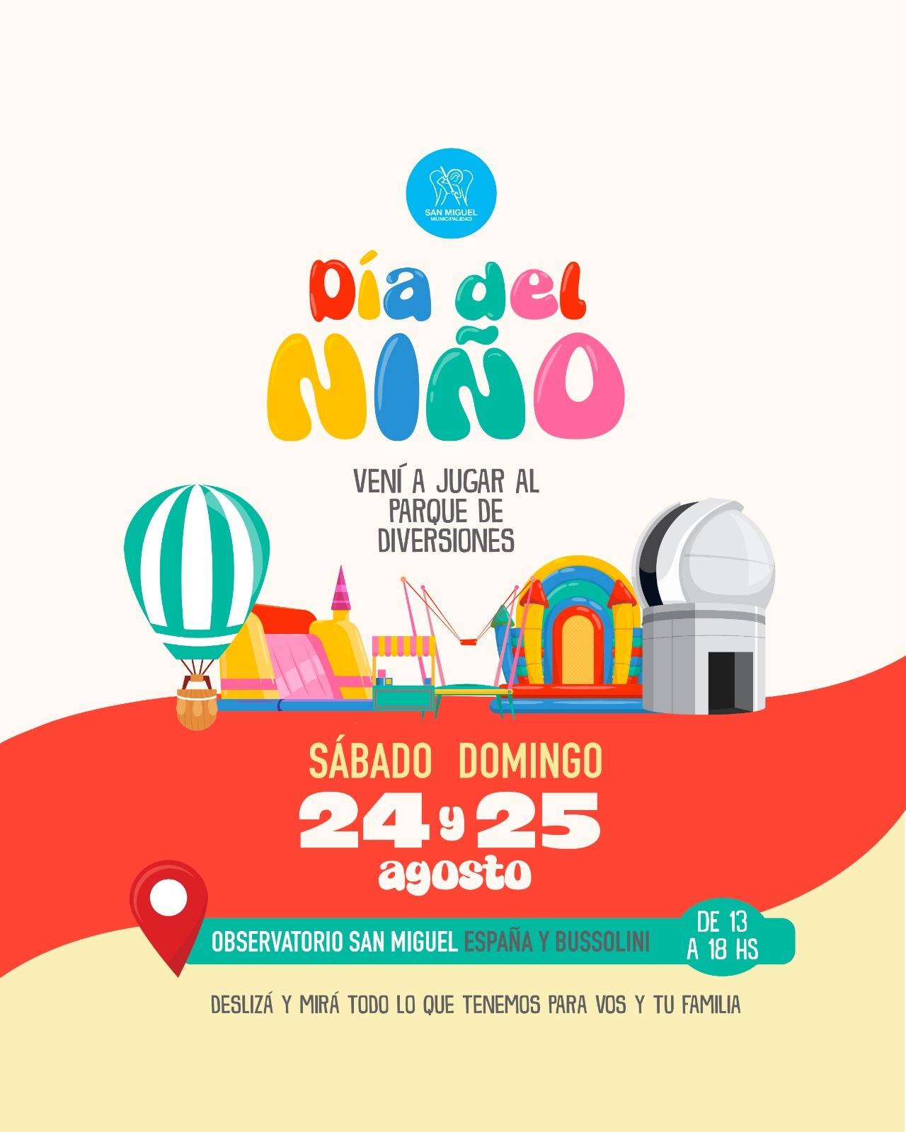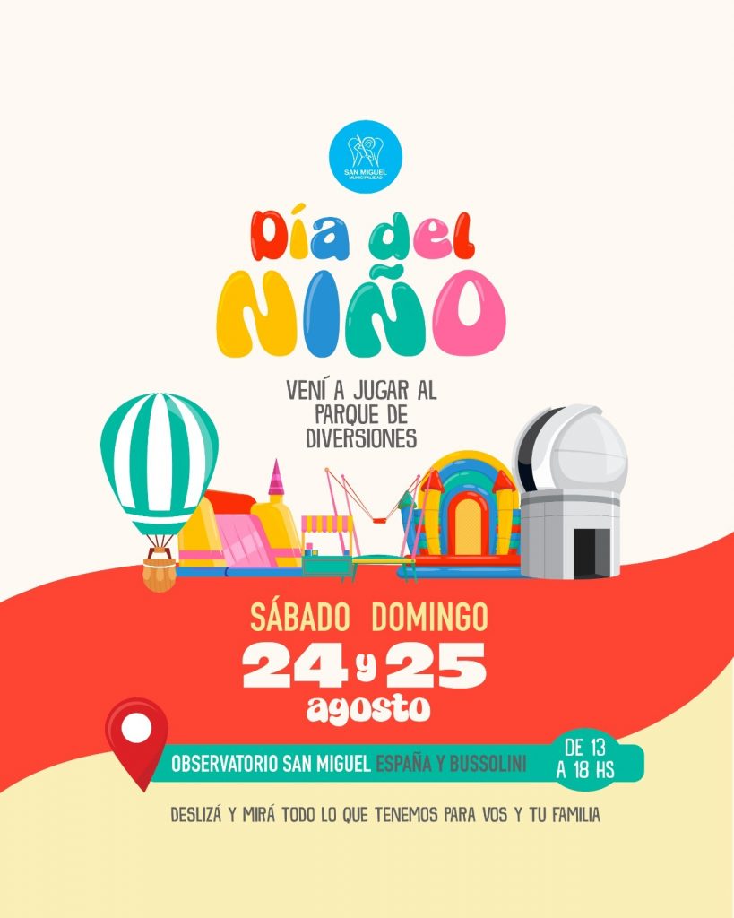 La Municipalidad de San Miguel celebrará el Día del Niño este sábado 24 y domingo 25 de agosto con un parque de diversiones en el predio del Observatorio de Física Cósmica, ubicado en España y Bussolini. Se trata de un evento para disfrutar en familia con una gran variedad de actividades.