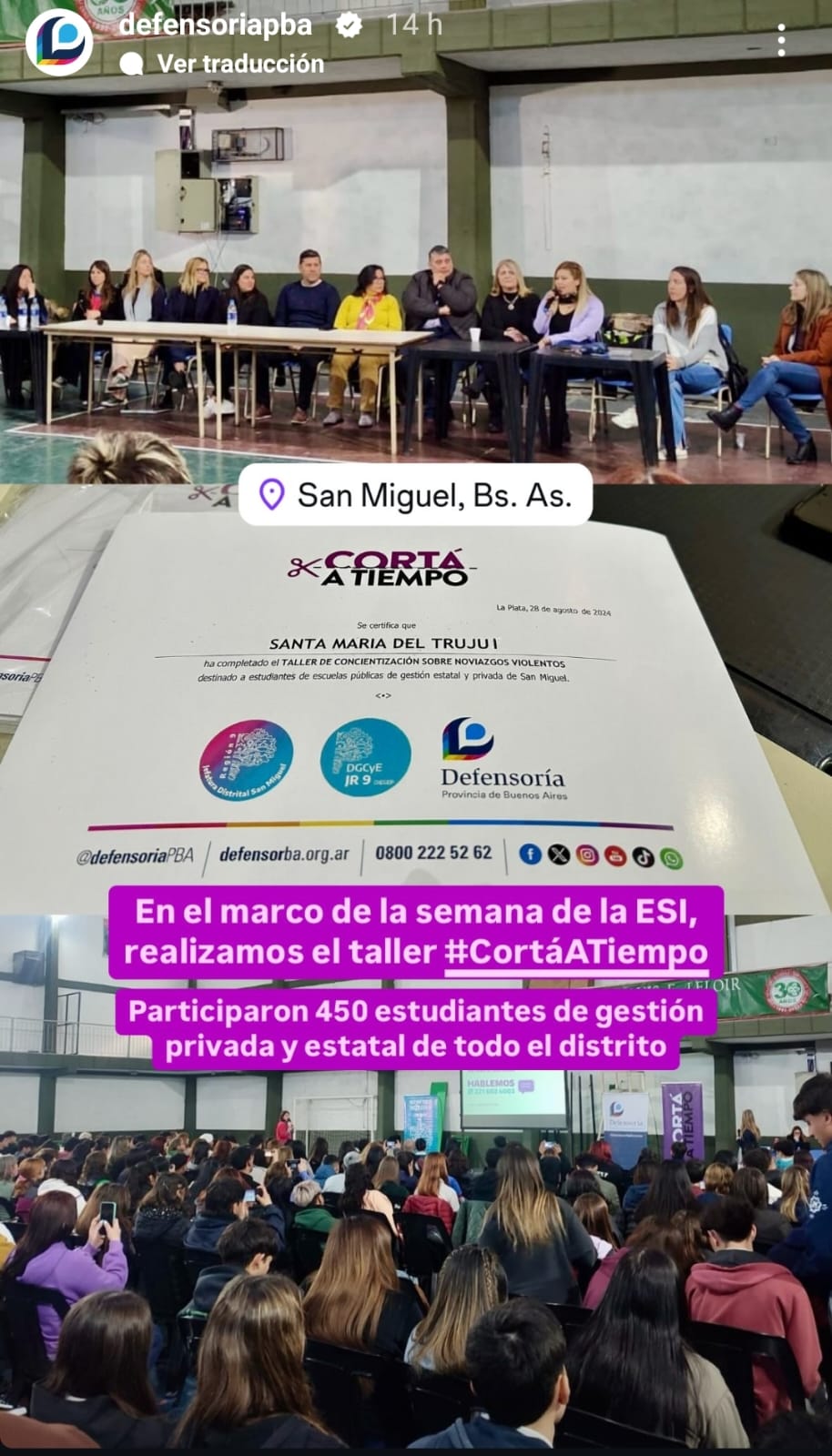 La Defensoría del Pueblo bonaerense presentó “Cortá a Tiempo” en el Colegio Leloir de San Miguel, el taller contra los noviazgos violentos que en esta oportunidad contó con la participación de más de 450 estudiantes de escuelas públicas y privadas de esa ciudad.