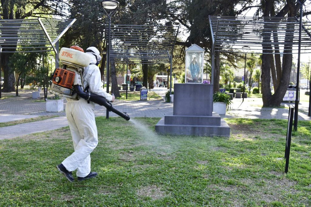 Así se fumigó en la Plaza San Martín de la ciudad Ing. Adolfo Sourdeaux.