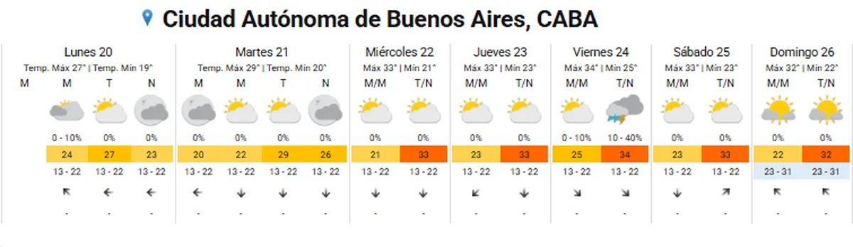 - Jueves 23: cielo mayormente nublado con una mínima de 23° y una máxima de 33°. Vientos del noreste por la mañana y por la tarde del norte.