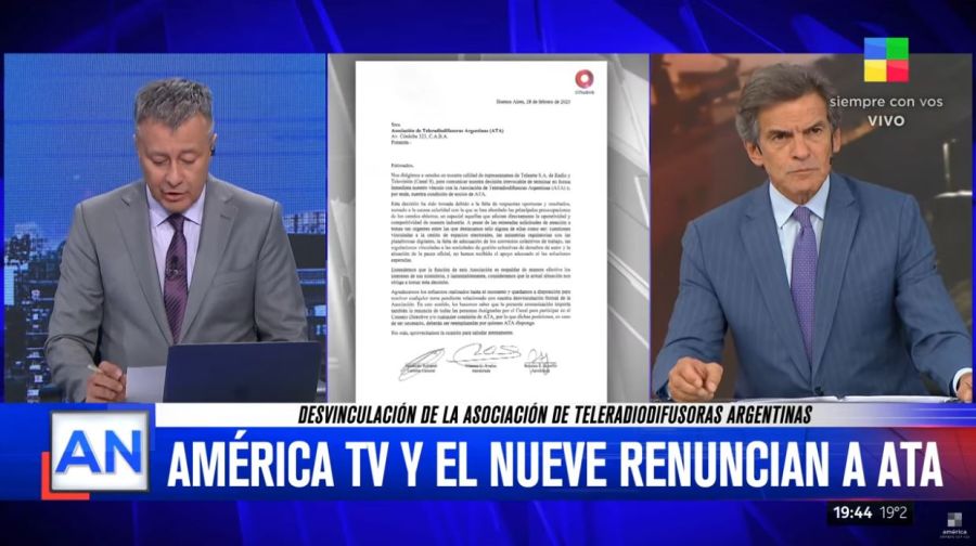 Ambos conductores leyeron el comunicado conjunto de América TV y El Nueve, donde informan que decidieron desvincularse de la Asociación de Teleradiodifusoras Argentinas (ATA) por la “falta de respuestas oportunas” y la “escasa celeridad” en la que se abordaron las principales preocupaciones de los canales abiertos.” “Creemos en consecuencia que ha llegado el momento de tomar otros caminos”, justificaron.