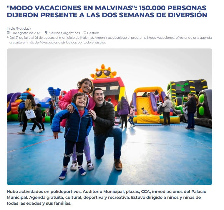 El municipio de Malvinas Argentinas desplegó el programa Modo Vacaciones, ofreciendo una agenda gratuita en más de 40 espacios distribuidos por todo el distrito. En total, pasaron aproximadamente 150.000 personas durante las dos semanas de duración.