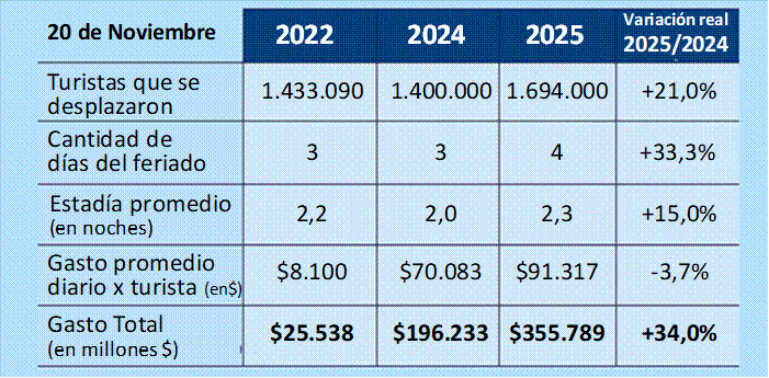 Desde la entidad sostuvieron que la gran afluencia de turistas se vio favorecida “por la combinación de un clima templado, una agenda nacional muy activa y el formato de cuatro días”. En promedio, esos 1,6 millones de viajantes pasaron 2,3 noches en el destino elegido y gastaron unos $91.317 per cápita. La cifra representa una caída del 3,7% en términos reales en comparación con el año pasado lo que refleja “un comportamiento más austero”, advirtió la CAME.