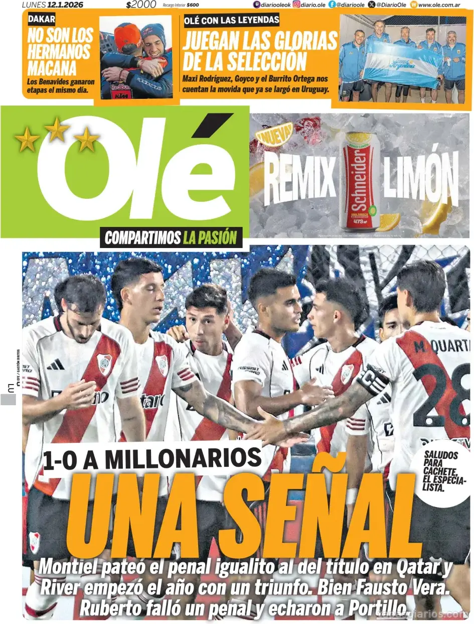 River Plate comenzó el año con una victoria al derrotar a Millonarios 1-0. Montiel marcó un penal que recordó al de la final en Qatar, destacando su desempeño en el partido. Fausto Vera brilló con un gran rendimiento, mientras que Ruberto falló un penal y el equipo rival quedó con un jugador menos tras la expulsión de Portillo. Las leyendas del fútbol argentino, como Maxi Rodríguez y Goyco Ortega, compartieron anécdotas sobre sus experiencias en la selección en un evento reciente en Uruguay. Además, los hermanos Benavides se destacaron en Dakar, ganando etapas el mismo día. No te pierdas todos los detalles de estos destacados eventos.