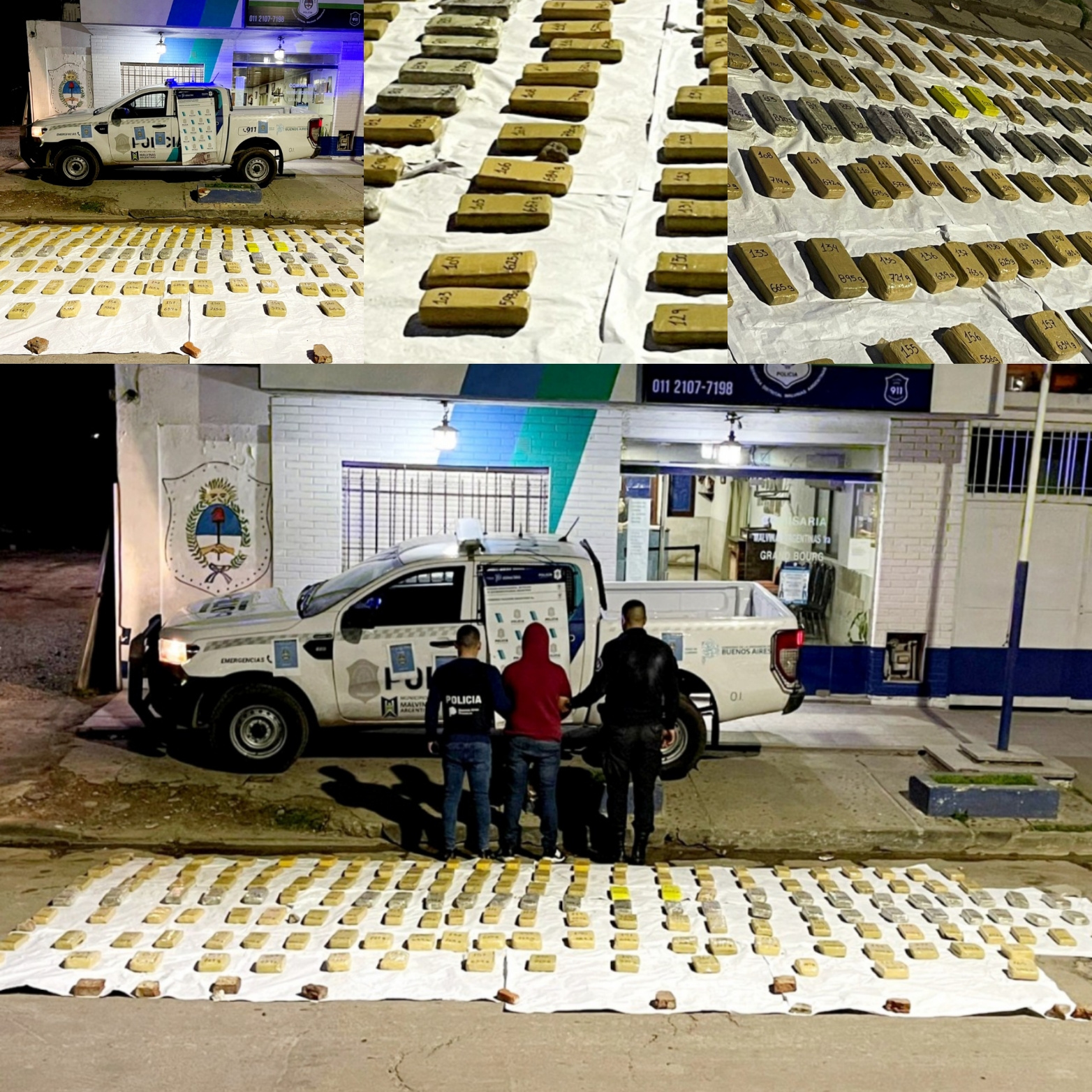 Al tomar la calle Viena en su intersección con Oliden en la ciudad de Grand Bourg, fue arrinconado por las patrullas que acudieron tras el aviso. En presencia de dos testigos de la zona, se revisó un bolso ubicado en el asiento trasero y se encontraron panes de marihuana fraccionados. Al abrir el baúl la sorpresa fue mayor ya que se encontraron decenas de ladrillos de similares características.