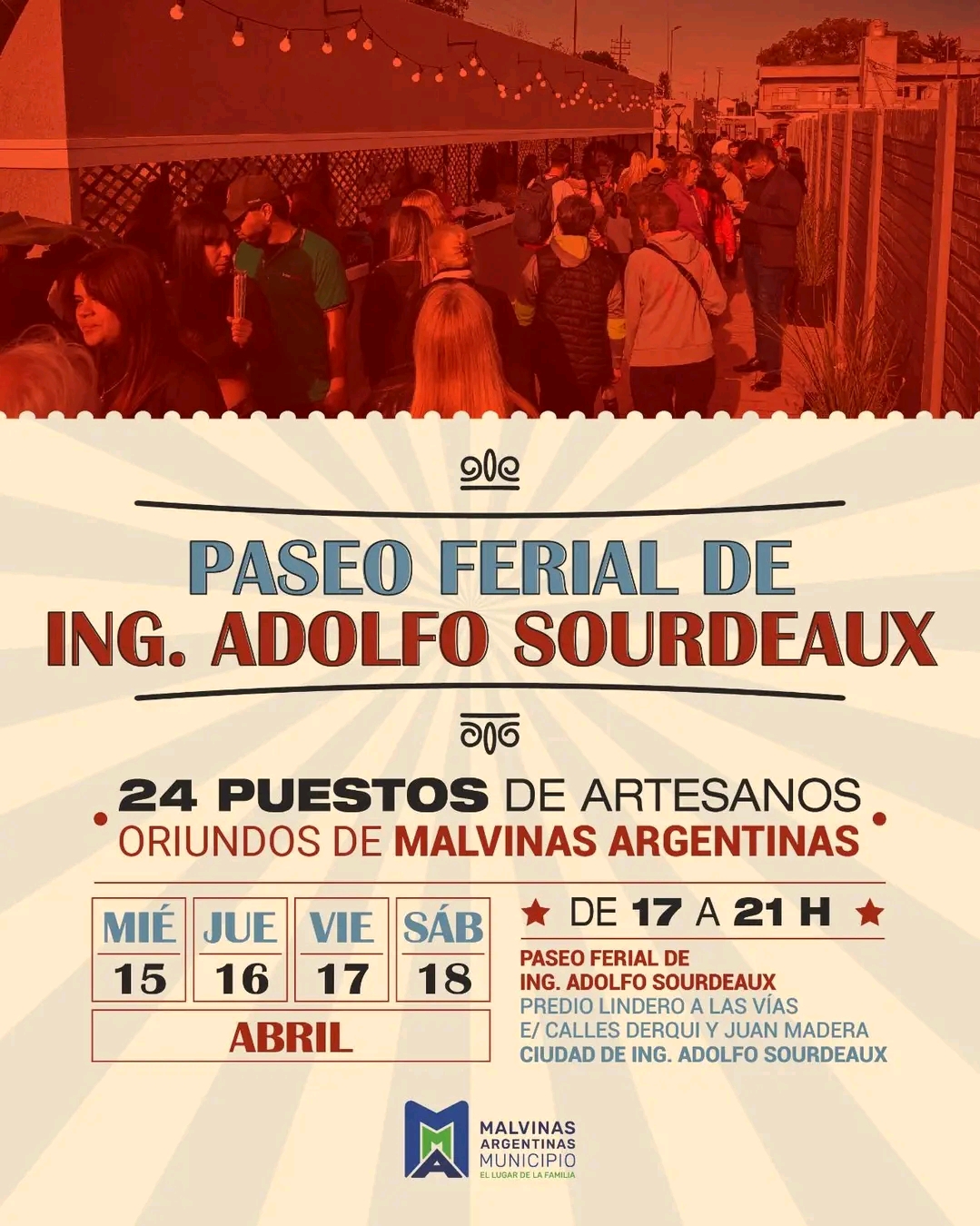 Paseo Ferial de ING. ADOLFO SOURDEAUX, veinticuatro puestos de artesanos oriundos de Malvinas Argentinas los días 15, 16, 17 y 18 de Abril de 17 a 21 HS.